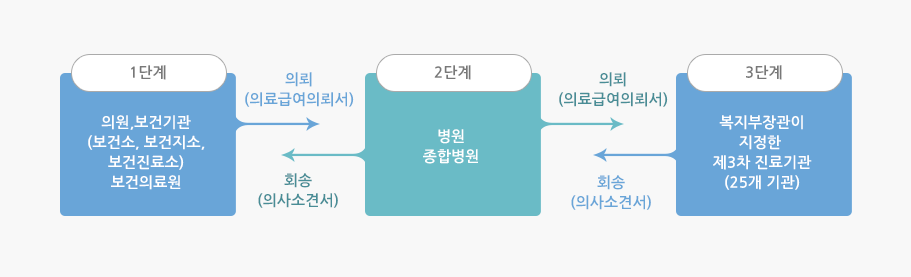 의료급여수급권자(1종, 2종)는 의료급여법에 의거 1차 진료기관(개인 병, 의원)에서 의료급여의뢰서를 지참하셔야